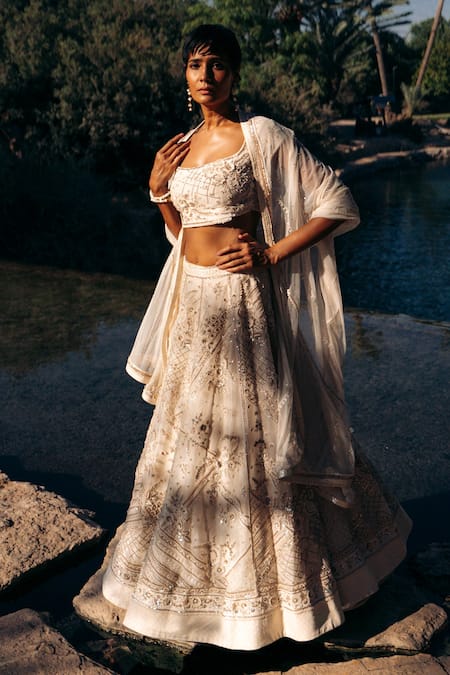 Ivory lehenga featuring all-over floral pattern embroidery. Paired with a beaded hem blouse and cancan.