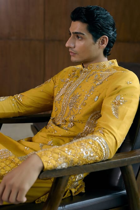 Yellow kurta set in Silk Katan features intricate applique and hand embroidery. Includes matching trouser and is ideal for celebrations and special occasions.