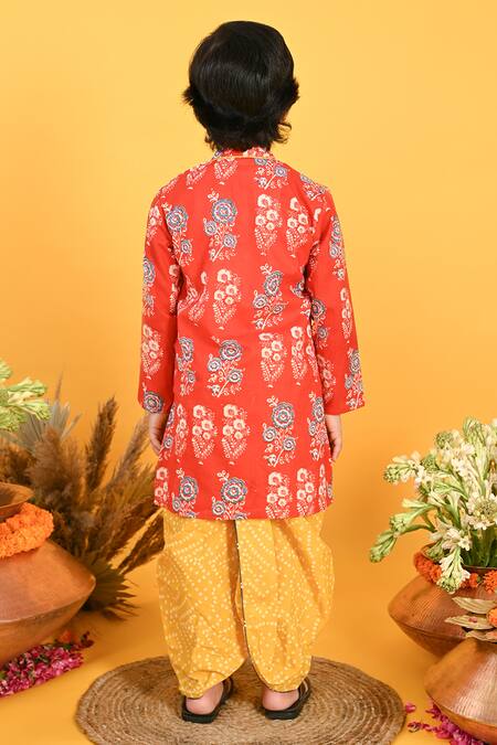 Red kurta featuring full sleeves, mandarin collar, and flower print. Paired with yellow bandhani printed dhoti pant with an elasticated waistband.
