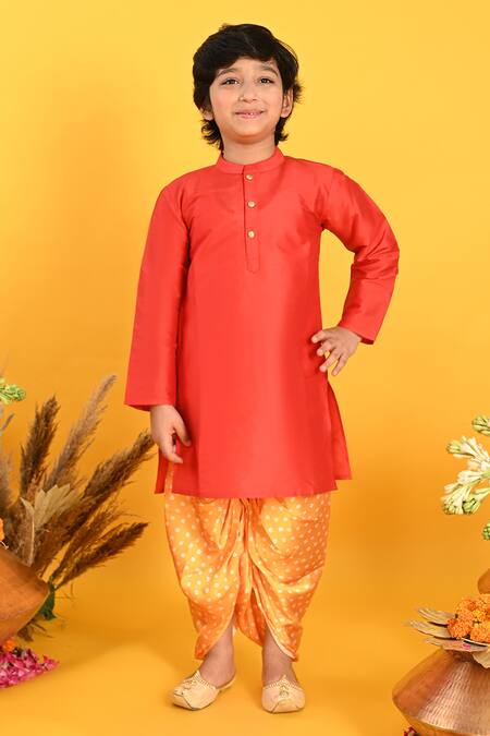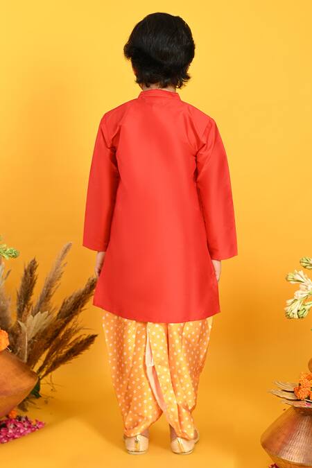 Red kurta featuring a mandarin collar and full sleeves. Paired with a bandhani print mustard dhoti pant with an elasticated waistband.