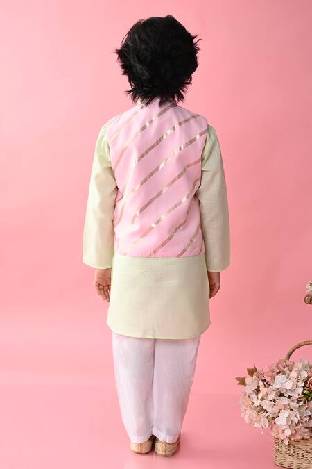 Pink bundi featuring stripe print and mandarin collar. Paired with a green kurta and pyjama with an elasticated waistband.