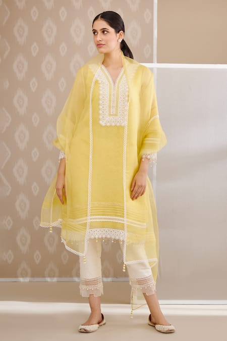 Buy_Bunka_Yellow Silk Organza Embellished Crochet Lace Salma Straight Set _Online_at_Aza_Fashions