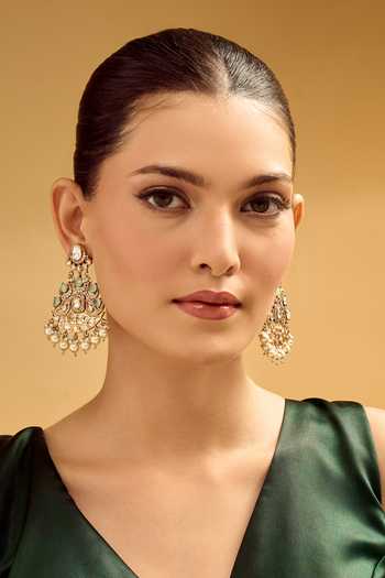 Intricate brass detailing with aqua stones, Pearl drops enhancing the design, Clear stone embellishments for added sparkle