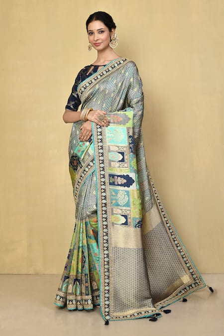 Buy_Samyukta Singhania_Green Denim, Silk Embroidery Bandhani And Mughal Pattern Saree With Running Blouse_at_Aza_Fashions