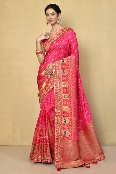 Purple bandhani printed saree featuring Mughal woven motifs and an embroidered border. It includes a tassel pallu for added elegance.