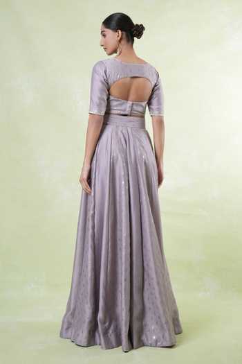 Purple Chanderi, Organza Embroidery Round Neck Mauve Floral Lehenga Set