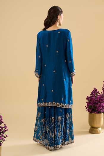 Blue kurta set featuring intricate gold embroidery on satin. Includes a kurta paired with a sharara and a dupatta, the sharara features an elastic waistband.