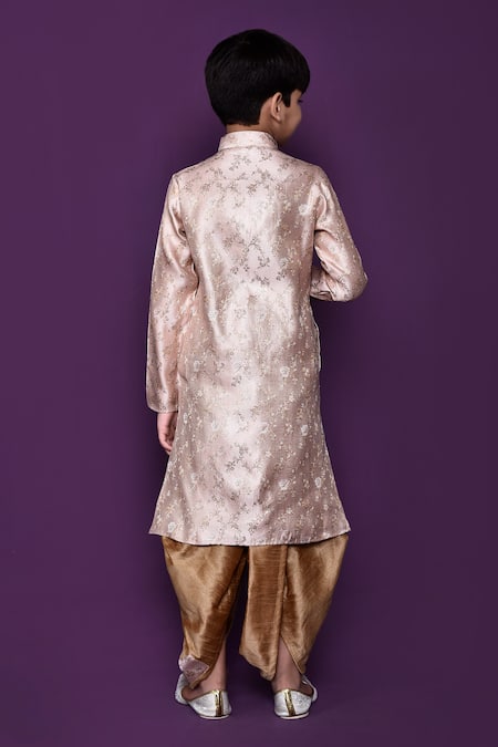 All-over floral woven patterns on kurta, Peach brocade border on dhoti pant