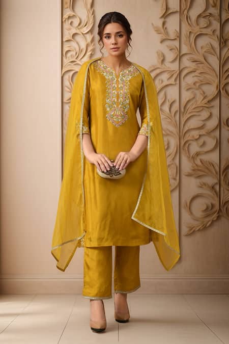 Mustard straight kurta featuring thread embroidered floral motifs on the yoke and side hem. Paired with coordinating lace embroidered solid pant and organza border embroidered dupatta.
