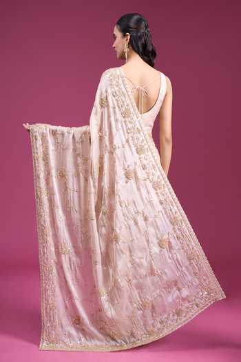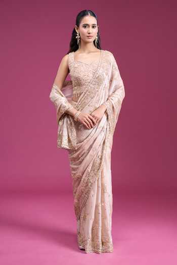 Gold tissue organza saree featuring intricate hand-beaded and sequin embroidery on the body and pallu. Comes with a padded matching blouse.