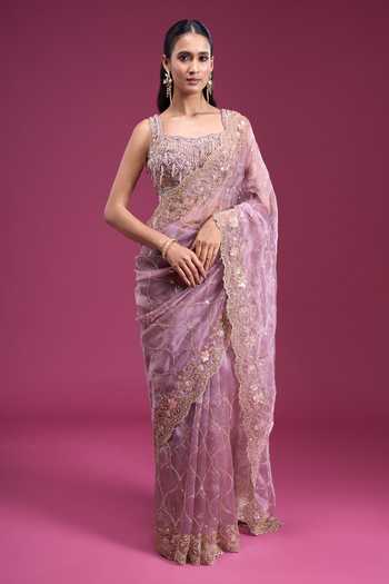 Purple Organza, Tissue Square Neck Handwork Jaal Pattern Saree With Blouse