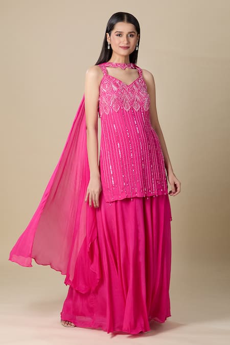 Hot pink kurta featuring heavy cut dana and sequence handwork. Paired with a matching sharara and dupatta.