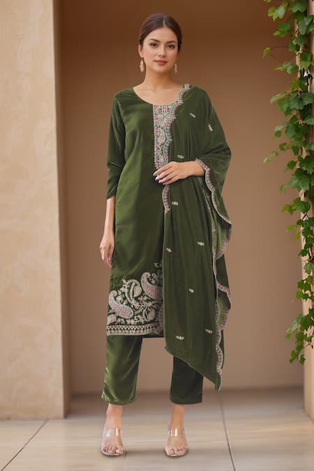 Grass green heavy velvet kurta featuring intricate embroidery on the front and hem. Paired with matching pants and a dupatta with scalloped edges.