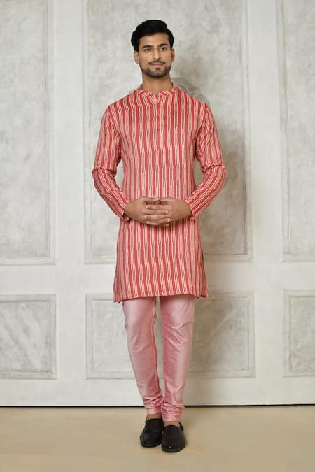 Coral cotton silk kurta featuring a mandarin collar and full sleeves with a linear print