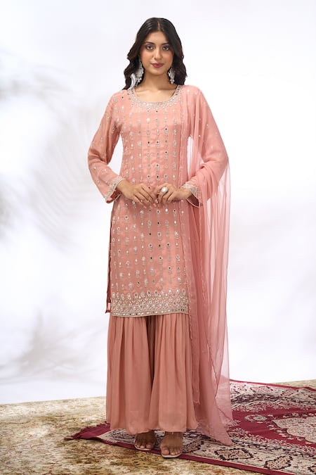 A peach georgette kurta featuring hand embroidery with mirror work and a round neckline. Paired with a matching sharara with a gathered hem and a sheer dupatta with scattered embellishments.