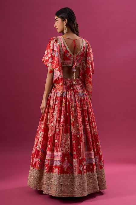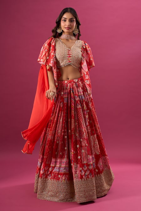 Red Silk, Chiffon, Polyester Zari, Embroidery, Beads, Multi Print Lehenga Set