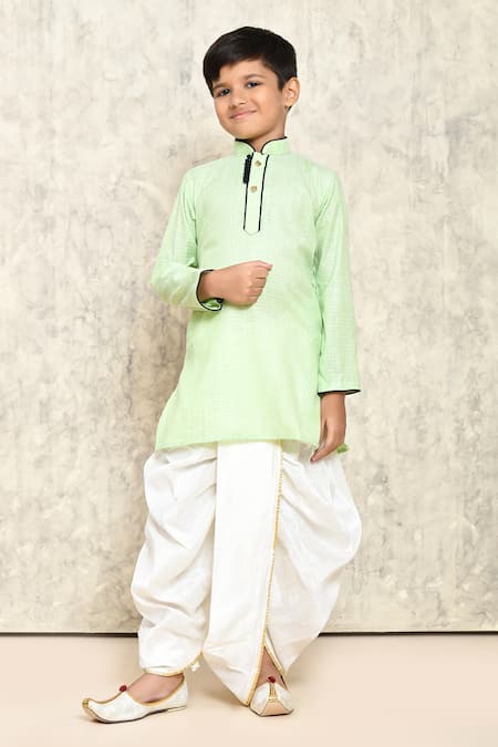 Light green kurta featuring a band collar, long sleeves, and contrast piped placket with potli button details. Paired with a white dhoti pant with gold detailing.