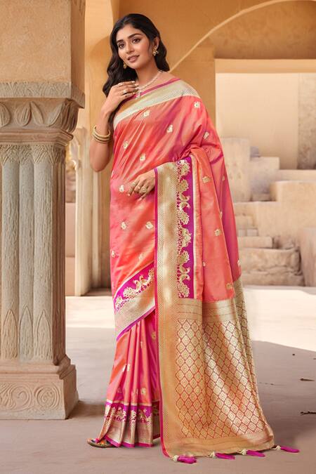 Orange Silk, Brocade Zari, Tassels Peacock Woven Saree With Sleeveless Blouse