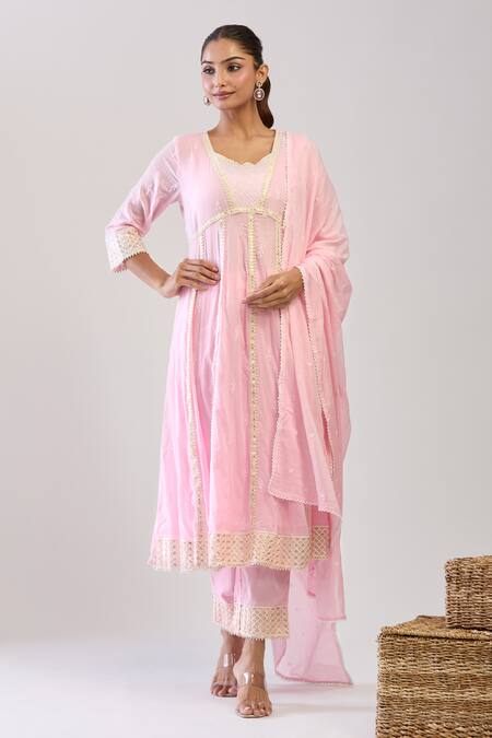 Buy_Samyukta Singhania_Pink Cotton Embroidery Round Neck Mulmul Anarkali Suit Set_at_Aza_Fashions