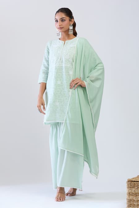 Pista green kurta featuring jacquard weave and embroidered details. Paired with a matching sharara and a lightweight dupatta.