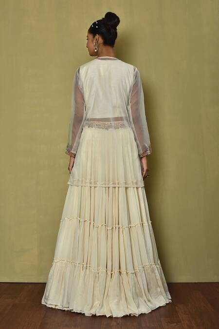 White lehenga set featuring a tiered design with an attached cancan. Accompanied by a sleeveless padded blouse and a sheer open jacket with floral thread embroidery.