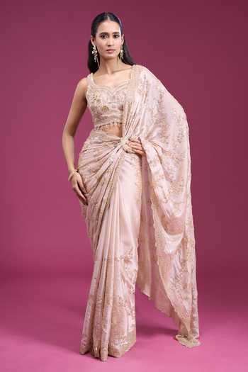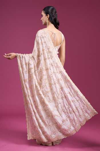 Gold saree in tissue organza with sequin handwork and an embellished pallu. Includes a padded blouse with tassel tie-back detailing.