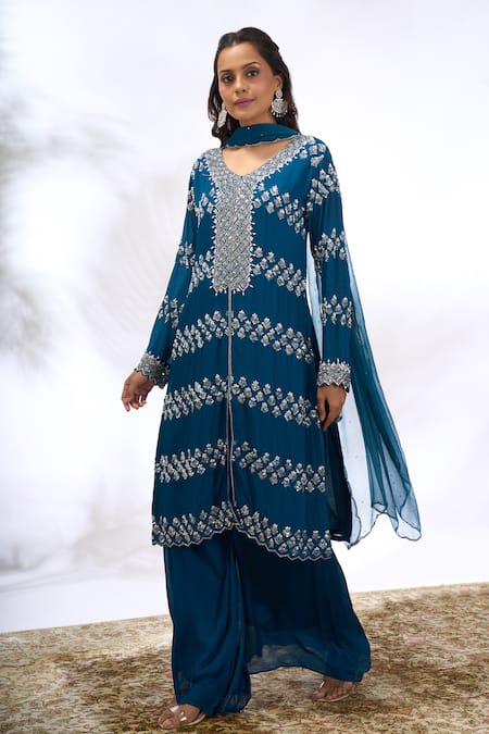 Buy_Samyukta Singhania_Blue Georgette Embroidery, Sequins V-neck Work Kurta Set _at_Aza_Fashions