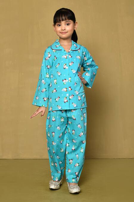 Blue cotton night suit featuring a button-down shirt with full sleeves and a Peter Pan collar. Paired with matching pyjama adorned with an all-over snow man cartoon print.