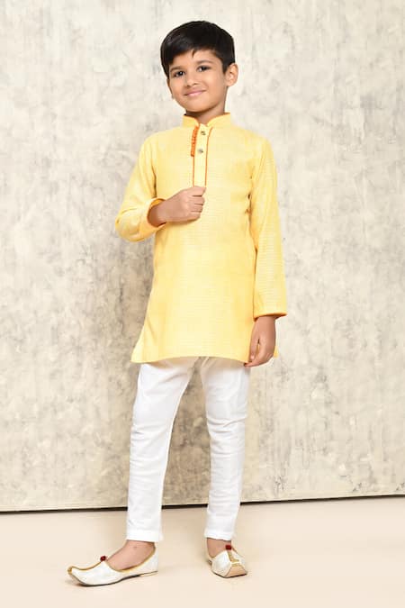 Yellow cotton kurta featuring an all-over stippled pattern with front potli buttons and side slits. Paired with white pants that have a front drawstring closure.