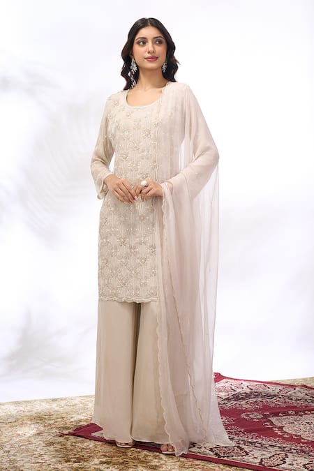 Buy_Samyukta Singhania_Ivory Georgette Embroidery Round Neck Straight Kurta And Sharara Set