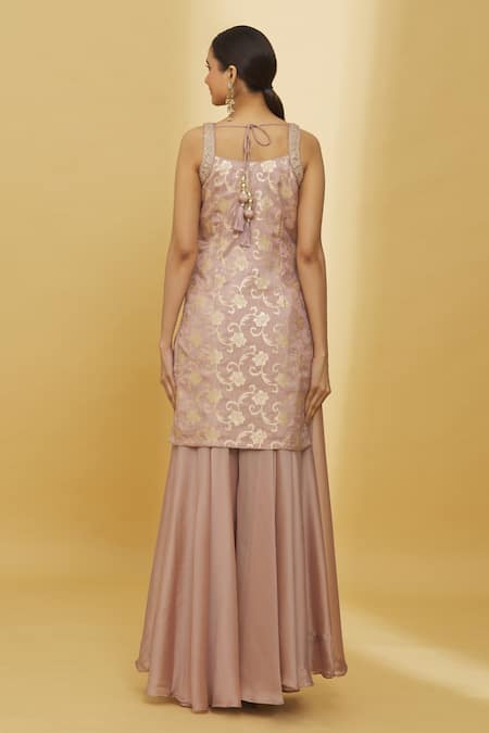 Peach Silk, Georgette Embroidery, Sequins, Woven Rose Pattern Kurta Palazzo Set