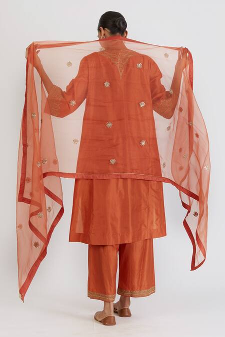 Rust orange chanderi dupatta with zardosi embroidered floral buttas.