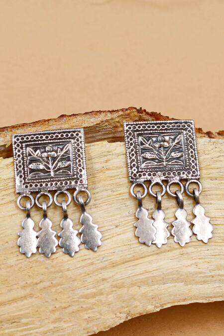 Silver toned quad shaped oxidised leaf drop earrings featuring carved plumeria depictions
