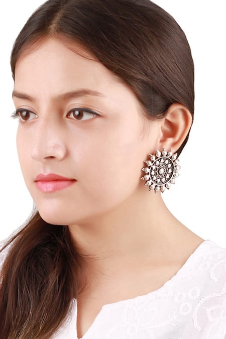 Silver stud earrings featuring a round shape with carved details