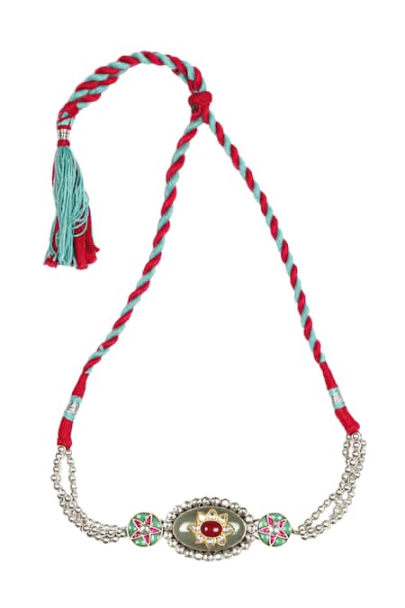 Silver choker featuring a floral motif with encrusted chalcedony, kundan, and pearl stones. Designed with a multi-bead string and an adjustable pull-out drawstring closure.