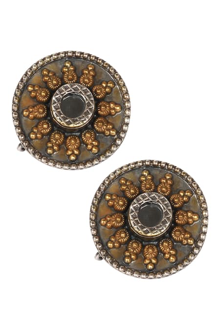 Gold and silver handmade stud earrings featuring a circular design with encrusted glass stones and 3D floral motif carvings