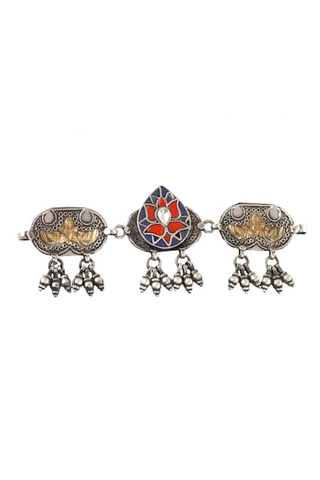 Silver and gold-tone choker featuring floral motifs and encrusted kundan-coral stones
