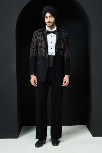 Black tuxedo highlighted with intricate pearls, sequins and thread work. Paired with a pintex shirt, tailored pants and a bow.