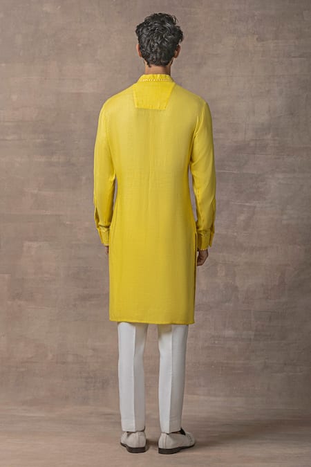 Yellow kurta featuring a mandarin collar and full sleeves. Paired with plain pants.
