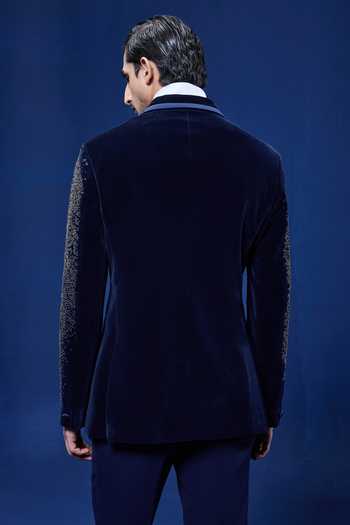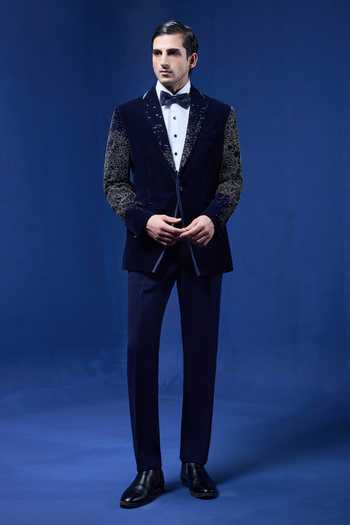 Navy Velvet Sequins, Pearls Placed Geometric Pattern Tuxedo Set
