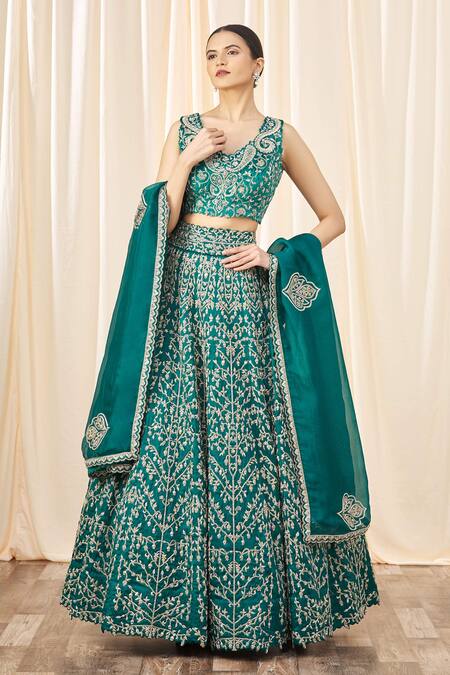 Forest green lehenga with all-over floral jaal motif zardozi & sequin work. Comes with cutwork neck blouse & embroidered dupatta.