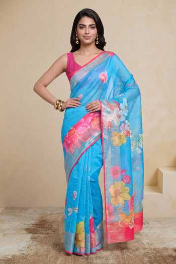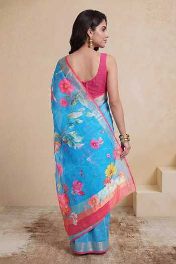 Sky blue saree featuring all-over floral motifs and a contrasting pink border. Linen fabric offers a breathable drape and the pallu showcases large floral prints.