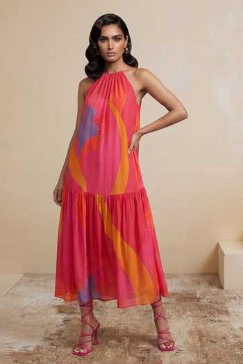 Pink midi dress with a halter neckline and bold floral print in viscose crepe. Flared tiered skirt creates a flowing silhouette.