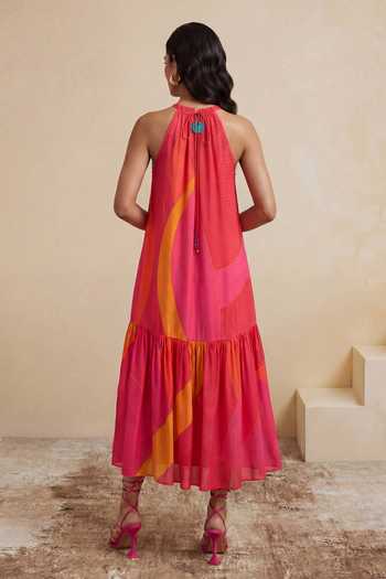 Magenta Crepe, Viscose Halter Neck Prismatic Petals Dress