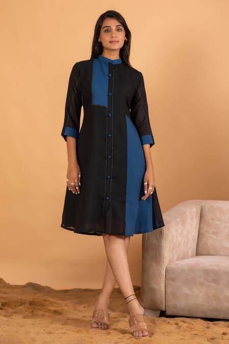 Black and blue colorblocked dress featuring handmade buttons and running embroidery in a linen blend base