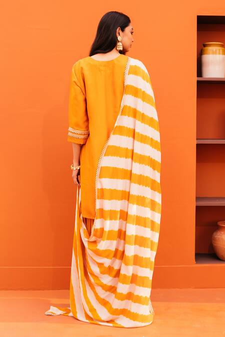 Orange kurta featuring tie & dye pattern and zardozi embroidery detailing. Paired with a coordinating sharara and dupatta.