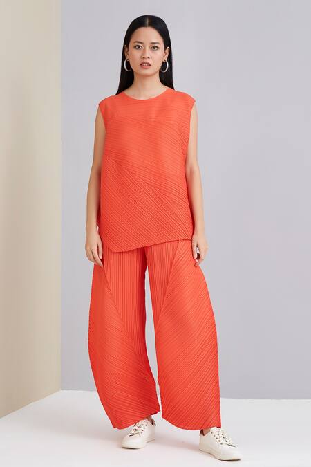 Buy_Scarlet Sage_Orange 100% Polyester Round Margo Pleated Top And Pant Set_Online_at_Aza_Fashions