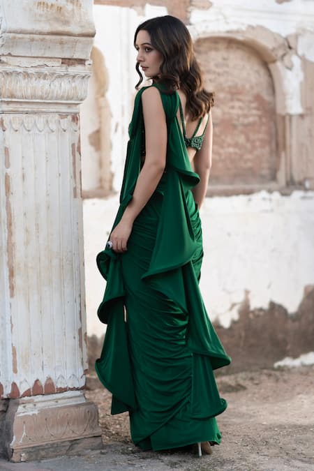 Emerald green pre-draped saree featuring ruffle detailing on the pallu. Paired with a back cut-out blouse embellished with crystal and glass bead embroidery.