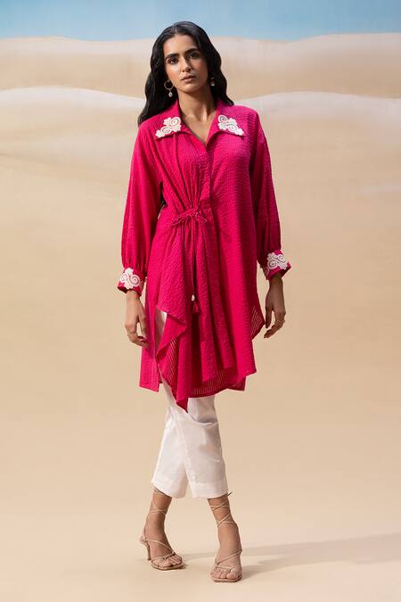 Buy_Seeaash_Pink Cotton Satin Striped Collar Neck Seersucker Dori Work Shirt With Pant_Online_at_Aza_Fashions