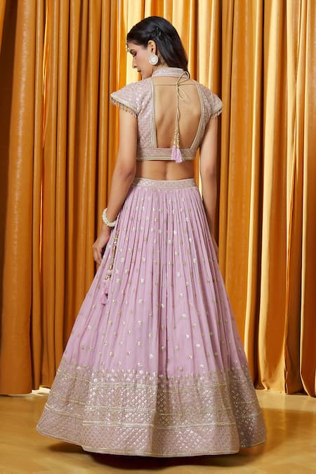 Lilac sequin embroidered pleated flared lehenga with attached can can. Comes with mandarin collar embroidered padded blouse and dupatta.